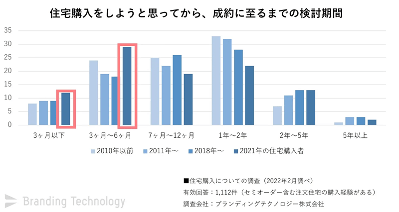 ブランディングテクノロジーが2022年に発表した「住宅購入についての調査」によると、約40%の購入者が「検討期間が半年以内」という結果で、過去と比較しても検討期間が短縮していることがわかりました。つまり、お客様が複数の不動産会社に同時に問い合わせている現代において、対応が少しでも遅れると他社で契約が決まってしまいます。