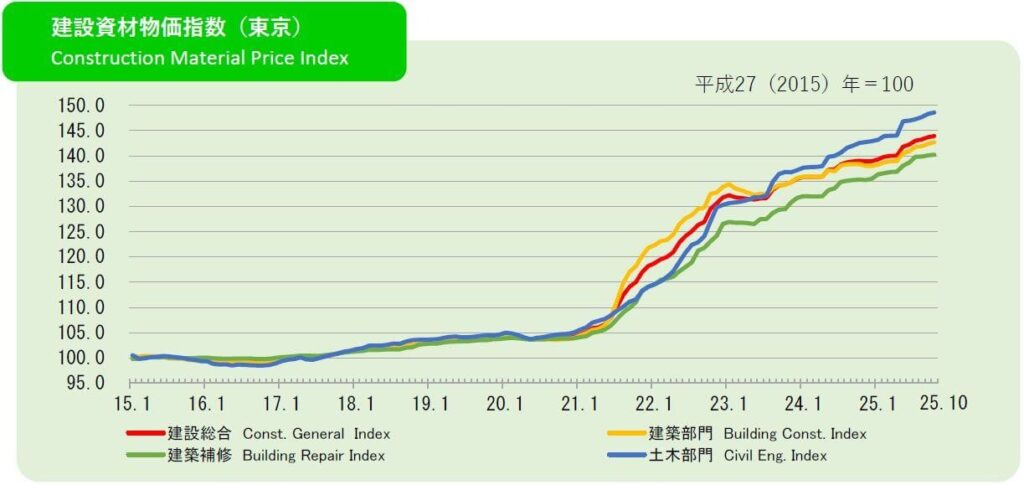 同時に、建築資材の価格高騰も深刻です。建設物価調査会の「建設資材物価指数」によると、2015年1月の住宅建設コストを100とした場合、2025年10月は143.9と、10年で140%以上上昇しています。