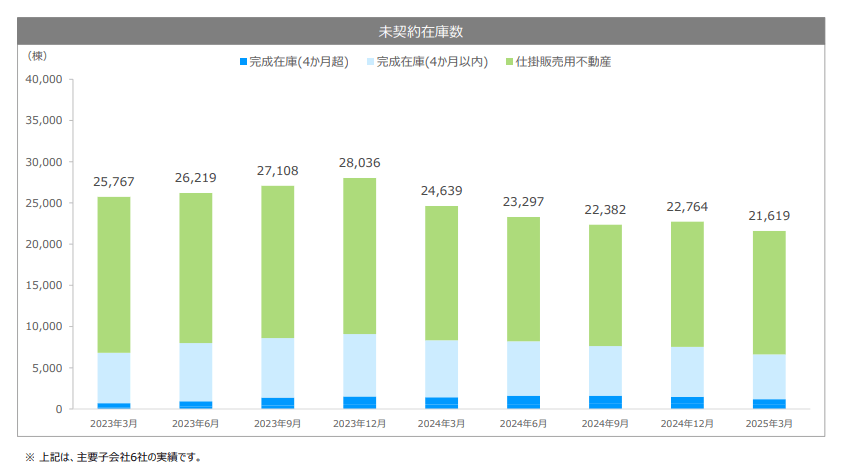 着工戸数の減少と同時に、深刻化しているのが在庫の積み上がりです。建売住宅最大手の飯田グループホールディングスの「2025年3月期決算説明資料」を見ると、2025年3月期末時点での戸建分譲事業の期末未契約在庫数は21,619棟でした。